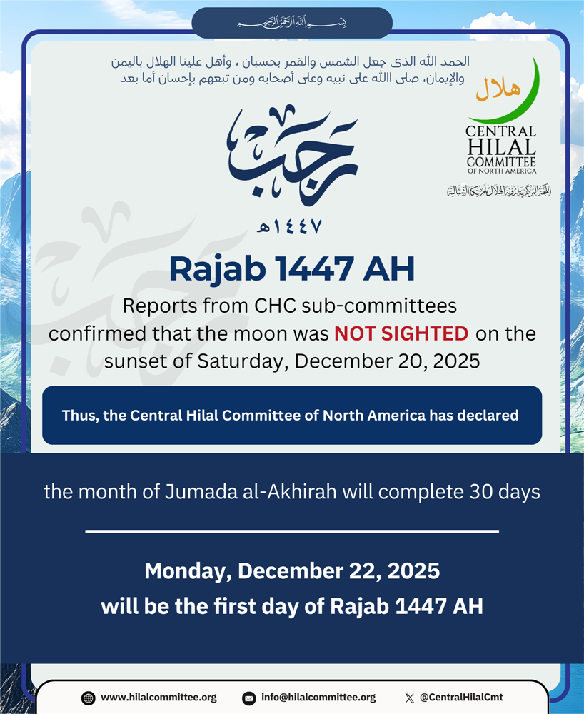 The crescent moon to commence the month ofRajab 1447 AHwas looked for after the sunset of Saturday, December 20, 2025.Reports from all Sub Committees ofCHC, both local and regional, unanimously confirmed that the moon wasNOT SIGHTED. Thus, theCentralHilalCommittee of North America has declared that the month ofJumadal Akhirah 1447 AH...