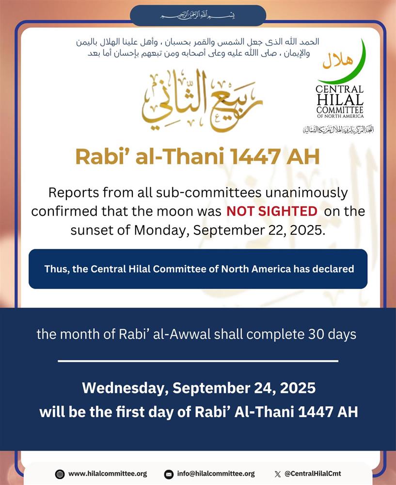 Dear Brothers/Sisters in Islam, Please make an effort to sight the Hilalon Monday, September 22, 2025, for the month of Rabi al-Thani 1447 AH. Alhamdulillah, by the joint effort of all the Ulama and great cooperation throughout the States, we have revived this forgotten Sunnah of moonsighting throughout the year in...
