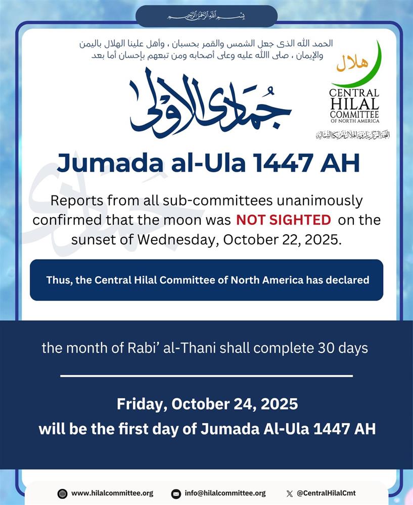 The crescent moon to commence the month ofJumada al-Ula 1447 AHwas looked for after the sunset of Wednesday, October 22, 2025.Reports from all Sub Committees ofCHC, both local and regional, unanimously confirmed that the moon wasNOT SIGHTED. Thus, theCentralHilalCommittee of North America has declared that the month ofRabi a-Thani 1447...