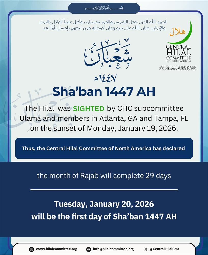 Dear Brothers/Sisters in Islam, Please make an effort to sight the Hilalon Saturday, December 20, 2025, for the month of Rajab 1447 AH. Alhamdulillah, by the joint effort of all the Ulama and great cooperation throughout the States, we have revived this forgotten Sunnah of moonsighting throughout the year in many...